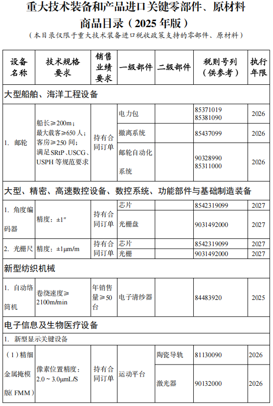 同步發(fā)布《國(guó)家支持發(fā)展的重大技術(shù)裝備和產(chǎn)品目錄(2025年版)》、《重大技術(shù)裝備和產(chǎn)品進(jìn)口關(guān)鍵零部件、原材料商品目錄(2025年版)》和《進(jìn)口不予免稅的重大技術(shù)裝備和產(chǎn)品目錄(2025年版)》,自2025年3月1日起執(zhí)行。