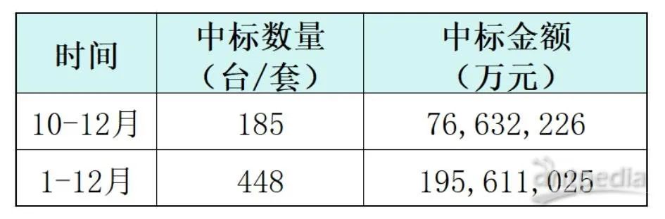 其中第四季度的中標數量占比最高,共162項中標信息,中標數量為185臺(套),達到全年總量的41%左右。第四季度的中標金額為7663萬元,這一數字占據了全年中標總金額的約39%。