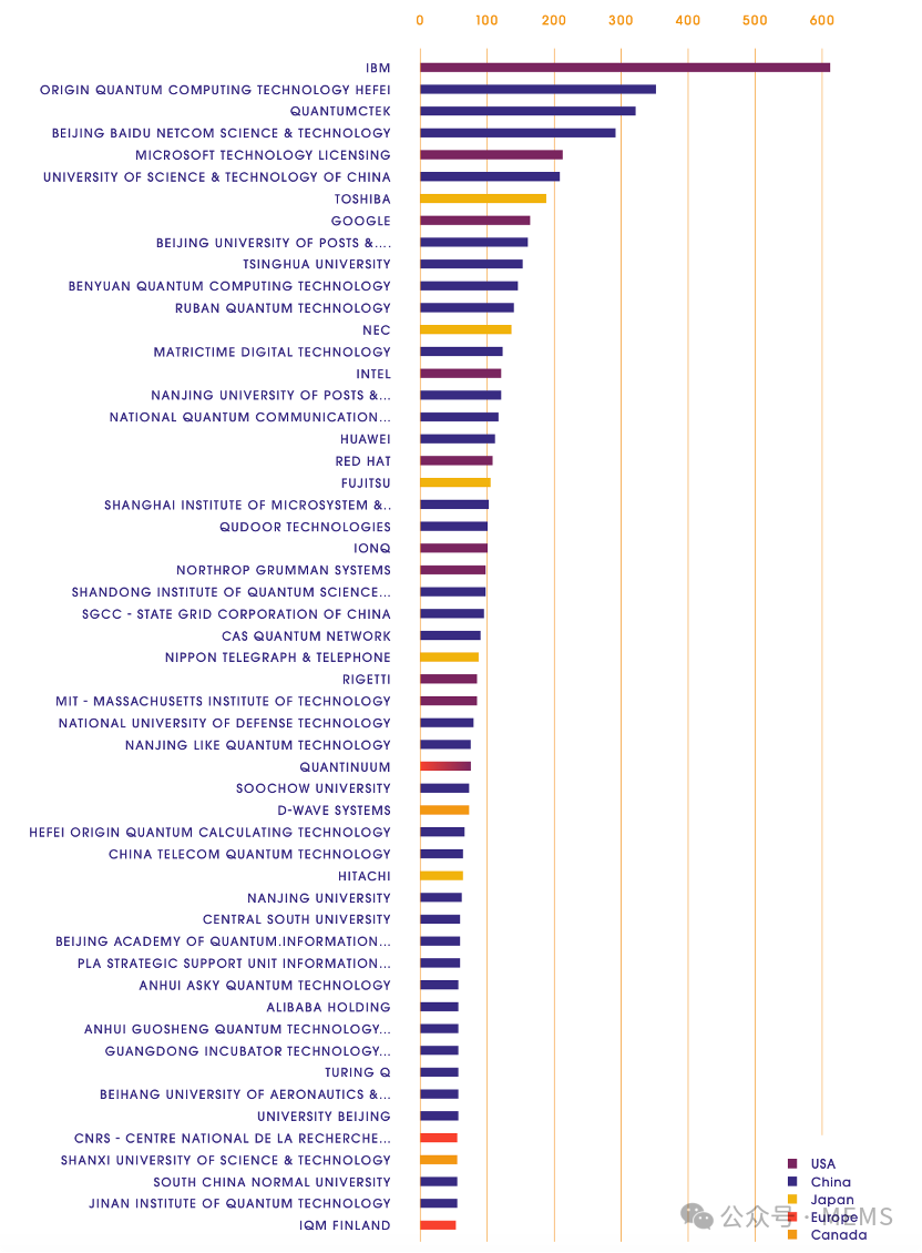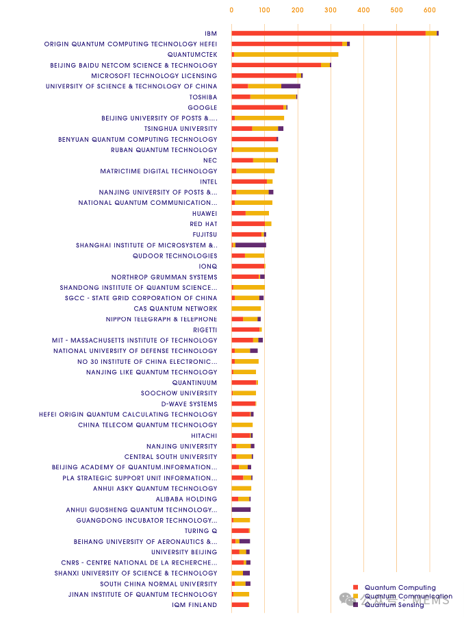 在中國申請的量子技術專利按申請量排名,前25位專利申請人中,除了三家來自美國的申請人(IBM、谷歌和微軟),其他全部為中國本土機構,包括本源量子計算科技(合肥)股份有限公司、北京百度網訊科技有限公司、科大國盾量子技術股份有限公司、如班量子科技有限公司、中國科學技術大學、清華大學、北京郵電大學及南京郵電大學等。
