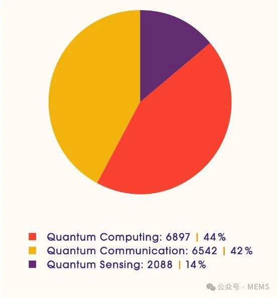 2024年,量子計算和量子通信領域的專利族占比明顯高于量子傳感,三者的占比分別為44%、42%14%。從2023年~2024年的增長率來看,量子計算和量子通信領域的專利增長也顯著高于量子傳感領域,三者的增長率分別為37%、22%3%。反映了當前全球量子技術領域的發展熱點和重點方向。