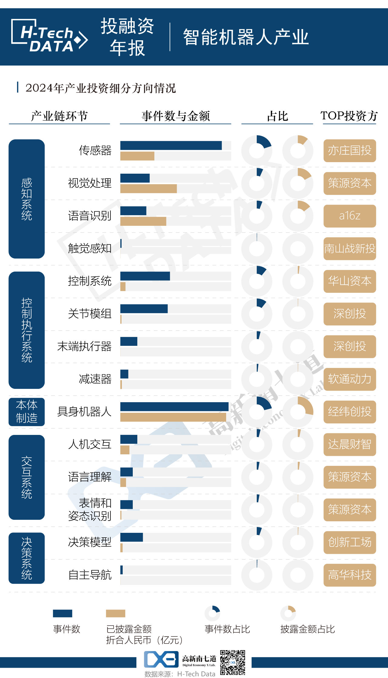 細(xì)分來(lái)看,機(jī)器人本體制造環(huán)節(jié)投資事件數(shù)量和金額最多,而感知系統(tǒng)緊隨其后,其中傳感器在感知系統(tǒng)中投資事件和金額占絕大多數(shù),事件數(shù)量上,感知系統(tǒng)-傳感器、視覺(jué)處理、語(yǔ)音識(shí)別合計(jì)收獲66起融資,占比18.6%。