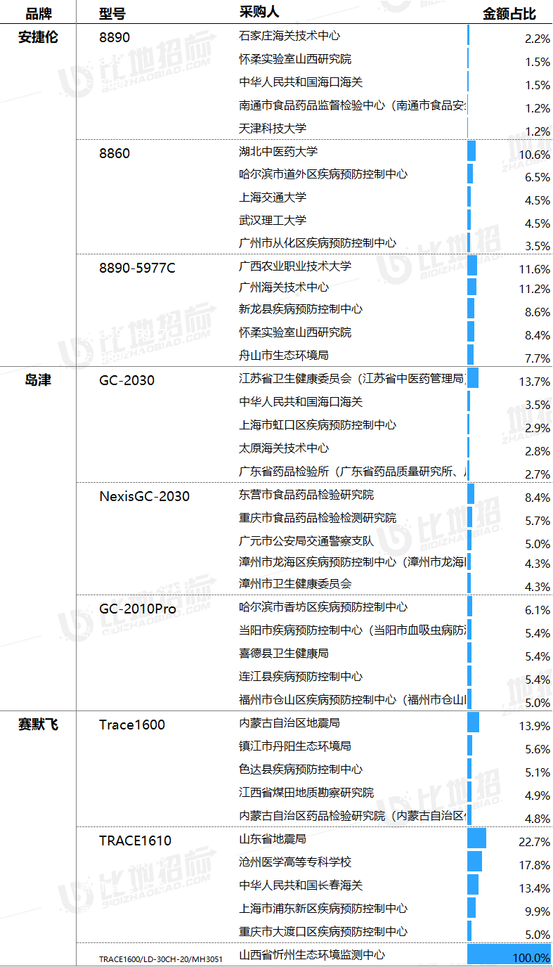 主要采購單位及對應中標品牌包括:石家莊海關技術中心(安捷倫),江蘇省衛(wèi)生健康委員會(江蘇省中醫(yī)藥管理局)(島津),內蒙古自治區(qū)地震局(賽默飛)等。