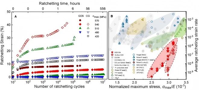 疲勞是金屬材料主要的失效形式之一,在承受循環(huán)應(yīng)力或交變載荷的工程結(jié)構(gòu)中表現(xiàn)尤為顯著。疲勞失效通常發(fā)生在遠低于材料屈服強度的應(yīng)力水平下,具有突發(fā)性和隱蔽性,對工程結(jié)構(gòu)安全構(gòu)成了嚴(yán)重威脅。其中,循環(huán)蠕變(棘輪效應(yīng))是一種嚴(yán)重的疲勞變形機制,表現(xiàn)為非對稱應(yīng)力循環(huán)與非零平均應(yīng)力作用下循環(huán)塑性應(yīng)變的單向累積,最終導(dǎo)致不可逆轉(zhuǎn)的結(jié)構(gòu)破壞。傳統(tǒng)高強度材料常伴隨循環(huán)軟化和應(yīng)變局域化現(xiàn)象,二者耦合加劇棘輪效應(yīng),加速構(gòu)件過早疲勞失效。提高高強度金屬材料的抗循環(huán)蠕變損傷能力,已成為材料工程領(lǐng)域亟待解決的重大技術(shù)挑戰(zhàn)。