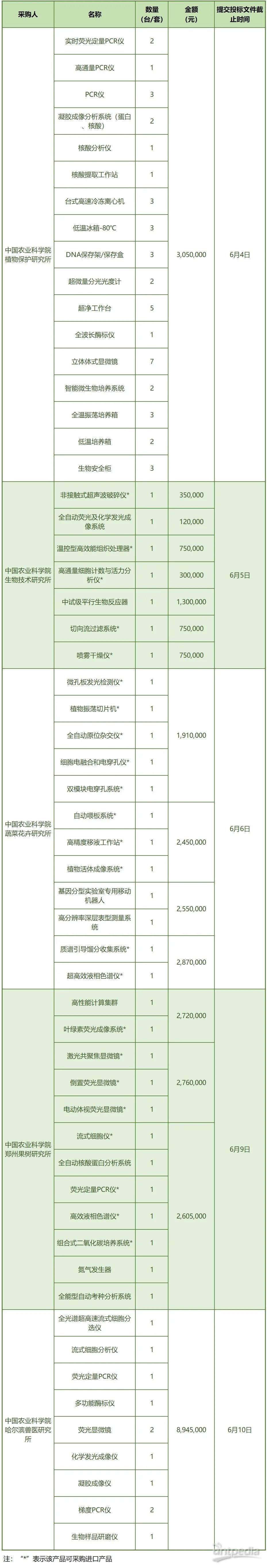 近日,中國農業科學院旗下多個研究所發布了儀器設備招標公告,包括果樹瓜類研究、人獸共患病病原研究、農業微生物智能設計與合成、農業生物安全科學等多個方向,預算總金額3418萬元,涵蓋多種先進的科研儀器設備,如PCR儀、核酸分析儀、超高效液相色譜儀、激光共聚焦顯微鏡等,其中有部分可采購進口產品。