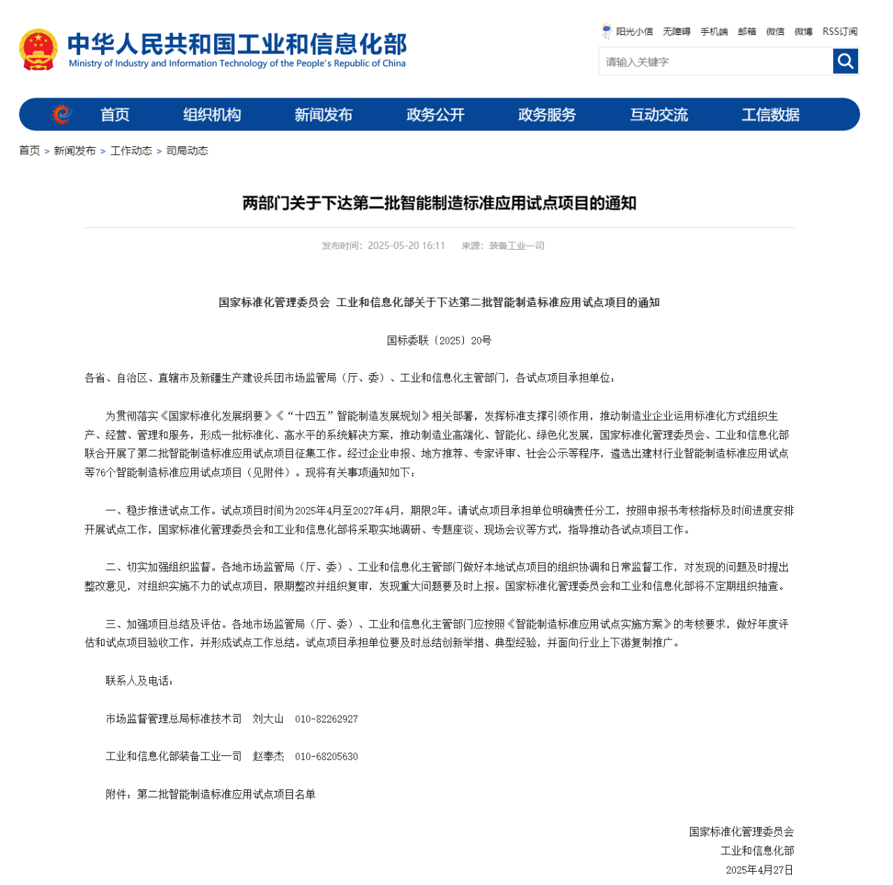 經(jīng)過(guò)企業(yè)申報(bào)、地方推薦、專(zhuān)家評(píng)審、社會(huì)公示等程序,國(guó)家標(biāo)準(zhǔn)化管理委員會(huì)、工業(yè)和信息化部近日下達(dá)第二批智能制造標(biāo)準(zhǔn)應(yīng)用試點(diǎn)項(xiàng)目名單,中核控制系統(tǒng)工程有限公司的“核設(shè)施DCS裝備智能制造標(biāo)準(zhǔn)應(yīng)用試點(diǎn)”,浙江萬(wàn)勝智能科技股份有限公司的“智能配用電智能工廠(chǎng)標(biāo)準(zhǔn)應(yīng)用試點(diǎn)”,福建順昌虹潤(rùn)精密儀器有限公司的“面向智能儀表生產(chǎn)的智能工廠(chǎng)標(biāo)準(zhǔn)應(yīng)用試點(diǎn)”,三川智慧科技股份有限公司的“智能水表智能工廠(chǎng)建設(shè)標(biāo)準(zhǔn)應(yīng)用試點(diǎn)”等76個(gè)智能制造標(biāo)準(zhǔn)應(yīng)用試點(diǎn)項(xiàng)目進(jìn)入名單。試點(diǎn)項(xiàng)目時(shí)間為2025年4月至2027年4月,期限2年。