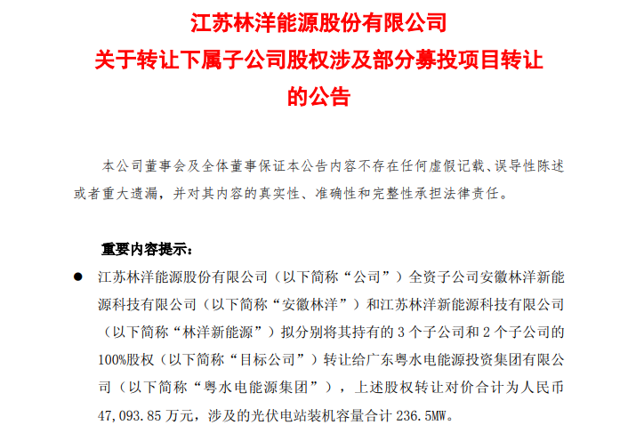 總價約4.71億元,林洋能源擬轉讓5家光伏公司