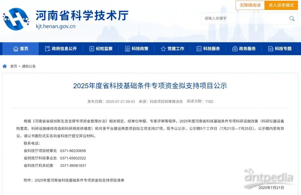 根據(jù)《河南省省級創(chuàng)新生態(tài)支撐專項資金管理辦法》相關(guān)規(guī)定,經(jīng)單位申報、專家評審等程序,2025年度河南省科技基礎(chǔ)條件專項科研設(shè)施改善(科研儀器設(shè)備購置類、科研設(shè)施維修改造和科研用房修繕類)和共享平臺建設(shè)兩類項目擬立項支持27項,現(xiàn)予以公示,公示期5個工作日(7月21日—7月25日)。公示期內(nèi)若有異議,請以書面形式實名向省科技廳提交異議材料。