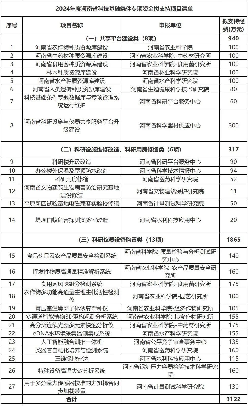 河南省科學技術(shù)廳對2025年度省科技基礎(chǔ)條件專項資金擬支持項目公示。擬支持項目清單含3類27個項目,擬支持經(jīng)費共計3122萬元。其中,共享平臺建設(shè)類(8項)940萬元,科研設(shè)施維修改造、科研用房修繕類(6項)317萬元,科研儀器設(shè)備購置類(13項)1865萬元。