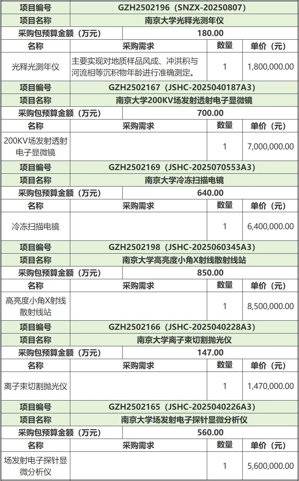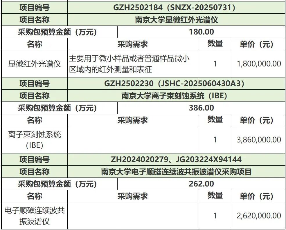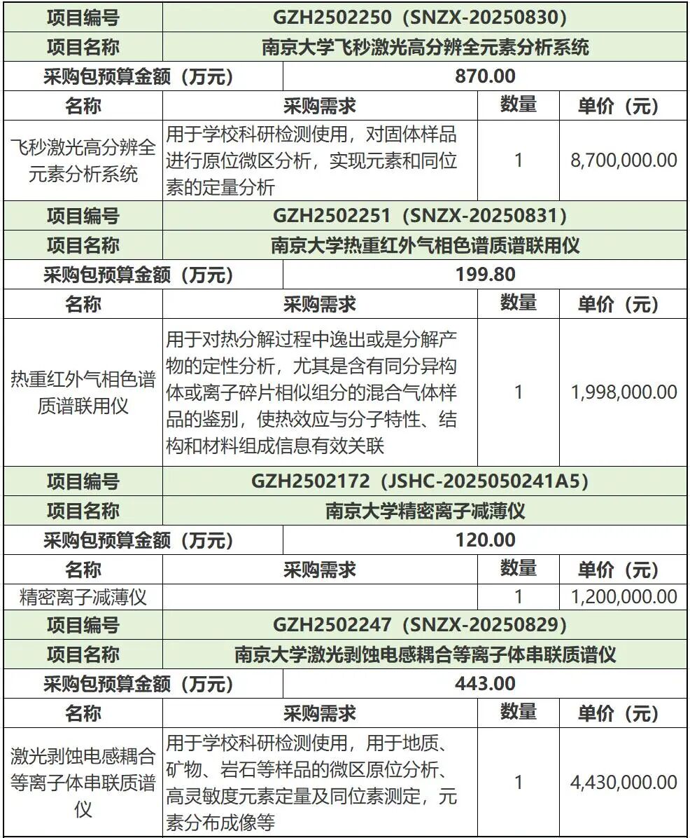 近日,南京大學(xué)多個科研儀器設(shè)備招標(biāo)項(xiàng)目發(fā)布,采購包括激光剝蝕電感耦合等離子體串聯(lián)質(zhì)譜儀、球差校正透射電鏡、冷凍雙束電鏡、飛秒激光高分辨全元素分析系統(tǒng),熱重紅外氣相色譜質(zhì)譜聯(lián)用儀、傅立葉變換離子回旋共振質(zhì)譜、硬X射線光電子能譜儀、高通量組織成像-多組學(xué)高分辨質(zhì)譜系統(tǒng)、場發(fā)射電子探針顯微分析儀、顯微紅外光譜儀等,總采購金額超1.45億元。