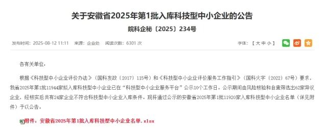 喜訊傳來!安徽省2025年第1批入庫科技型中小企業名單正式公示,合肥精大儀表股份有限公司赫然在列,這是對我司科技創新實力與持續發展潛力的高度認可。尤為值得一提的是,自2018年起,合肥精大已連續多年榮膺此殊榮,彰顯了其在行業內的領先地位和強勁的發展勢頭。