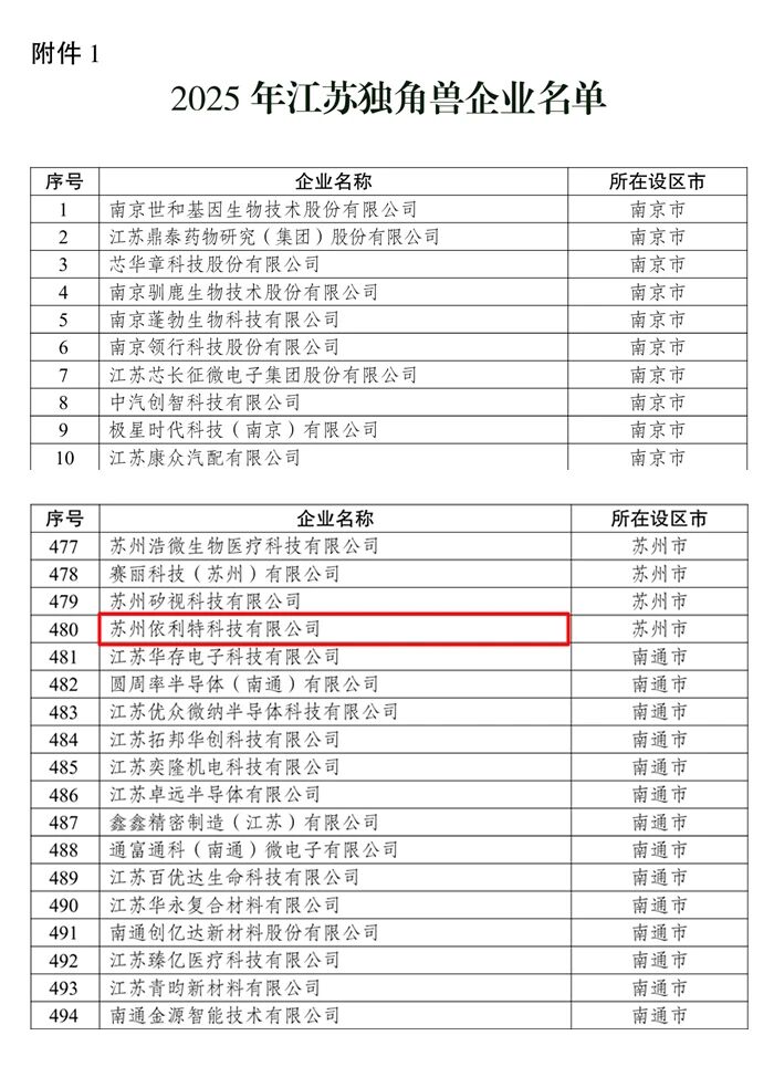 近日,江蘇省新質(zhì)生產(chǎn)力促進(jìn)中心正式發(fā)布《關(guān)于發(fā)布 2025 年江蘇獨角獸企業(yè)評估結(jié)果的通知》,經(jīng)過嚴(yán)格遴選與專業(yè)評估,蘇州依利特科技有限公司憑借在技術(shù)創(chuàng)新、產(chǎn)業(yè)潛力與高質(zhì)量發(fā)展貢獻(xiàn)方面的突出表現(xiàn),成功榮登 2025 年江蘇獨角獸企業(yè)名單,成為江蘇省高成長企業(yè)群體中的代表之一。