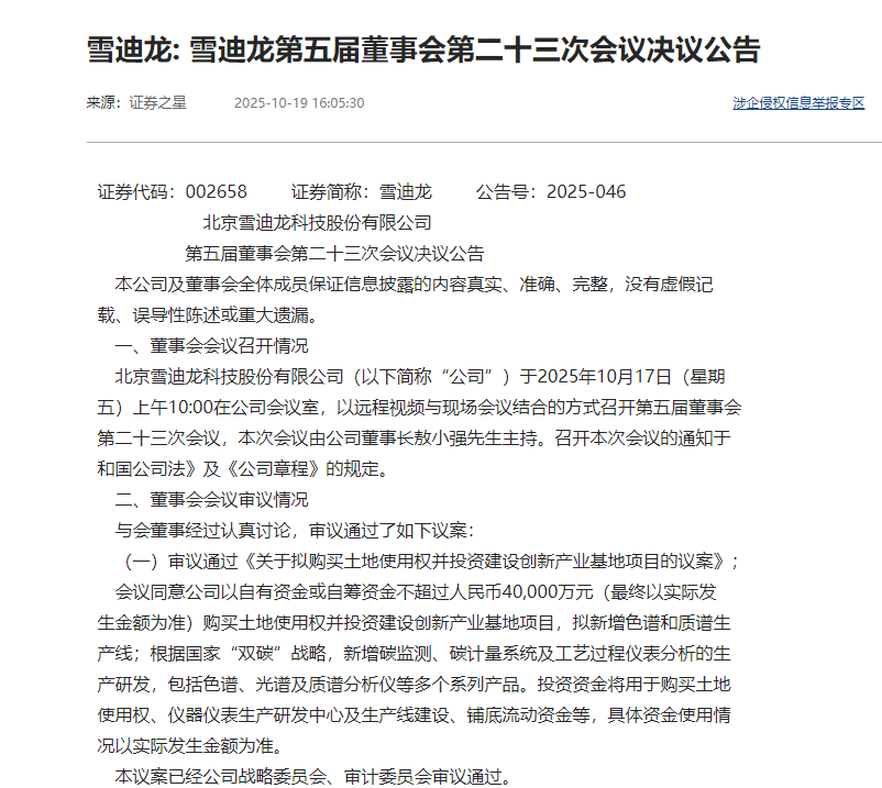 10月19日晚間,北京雪迪龍科技股份有限公司(股票代碼:002658)發(fā)布一則重磅公告,擬投資不超過(guò)4億元,購(gòu)買(mǎi)位于北京市昌平區(qū)的國(guó)有建設(shè)用地使用權(quán)并建設(shè)包括色譜和質(zhì)譜生產(chǎn)線的創(chuàng)新產(chǎn)業(yè)基地項(xiàng)目。