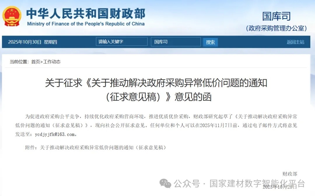 10月28日,財(cái)政部發(fā)布關(guān)于征求《關(guān)于推動(dòng)解決政府采購異常低價(jià)問題的通知(征求意見稿)》意見的函。