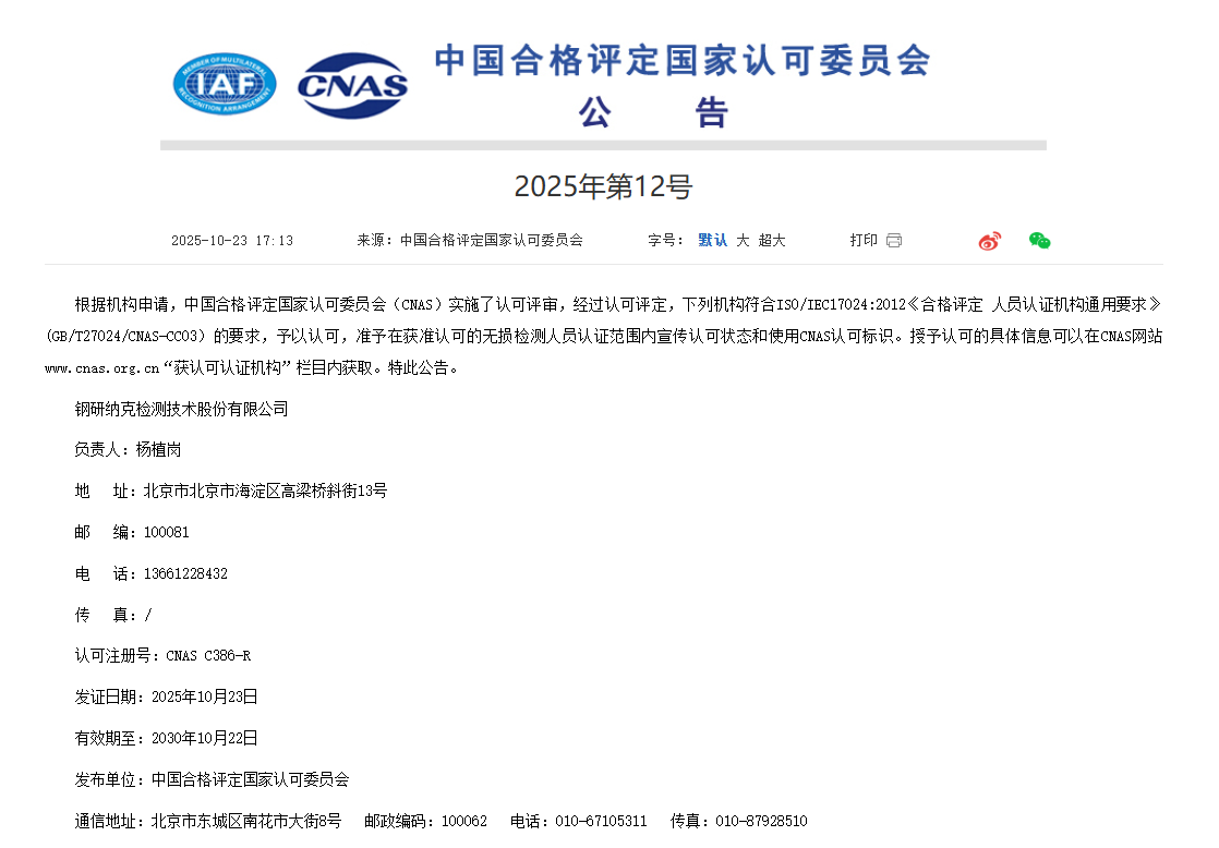 20251023日,中國合格評定國家認可委員會(CNAS)正式發布 2025 年第 12 號公告:“關于授予鋼研納克檢測技術股份有限公司人員認證機構基本認可制度認可資格的公告”,標志著鋼研納克作為我國首個試點的無損檢測人員認證機構獲得CNAS認可。