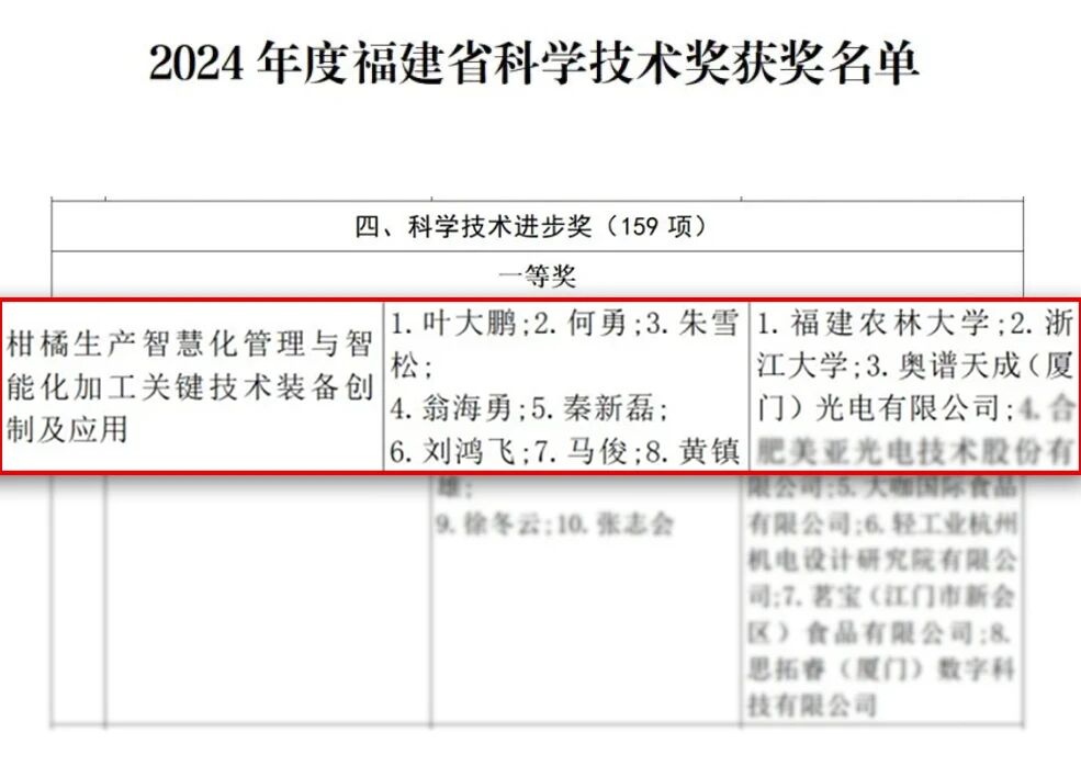 近日,奧譜天成憑借《基于高光譜多譜融合技術的柑橘生長全周期與品質檢測系統》榮獲福建省科技進步一等獎。該獎項由福建省人民政府設立,是省內最高級別的科技榮譽之一,重點表彰在技術創新、工程應用及行業貢獻方面取得突出成果的單位。本次獲獎不僅體現了該項目在關鍵技術上的創新突破,也標志著奧譜天成在農業智能檢測裝備領域的領先實力得到權威認可。