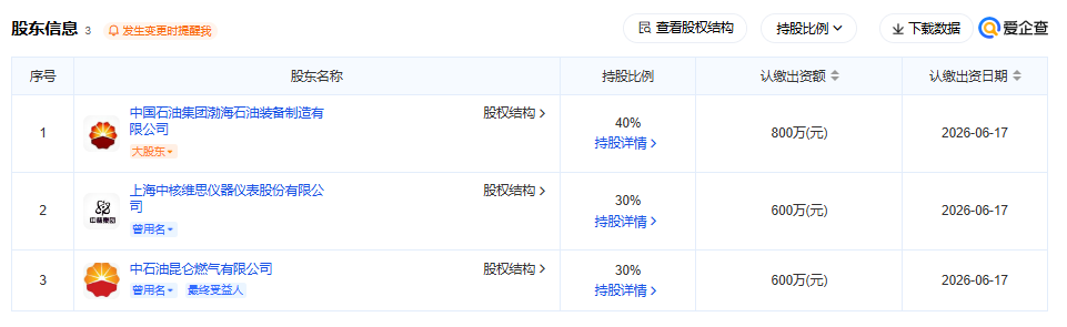 股權穿透圖顯示,該公司由中國石油天然氣集團有限公司旗下中國石油集團渤海石油裝備制造有限公司、中石油昆侖燃氣有限公司、上海中核維思儀器儀表股份有限公司共同持股。