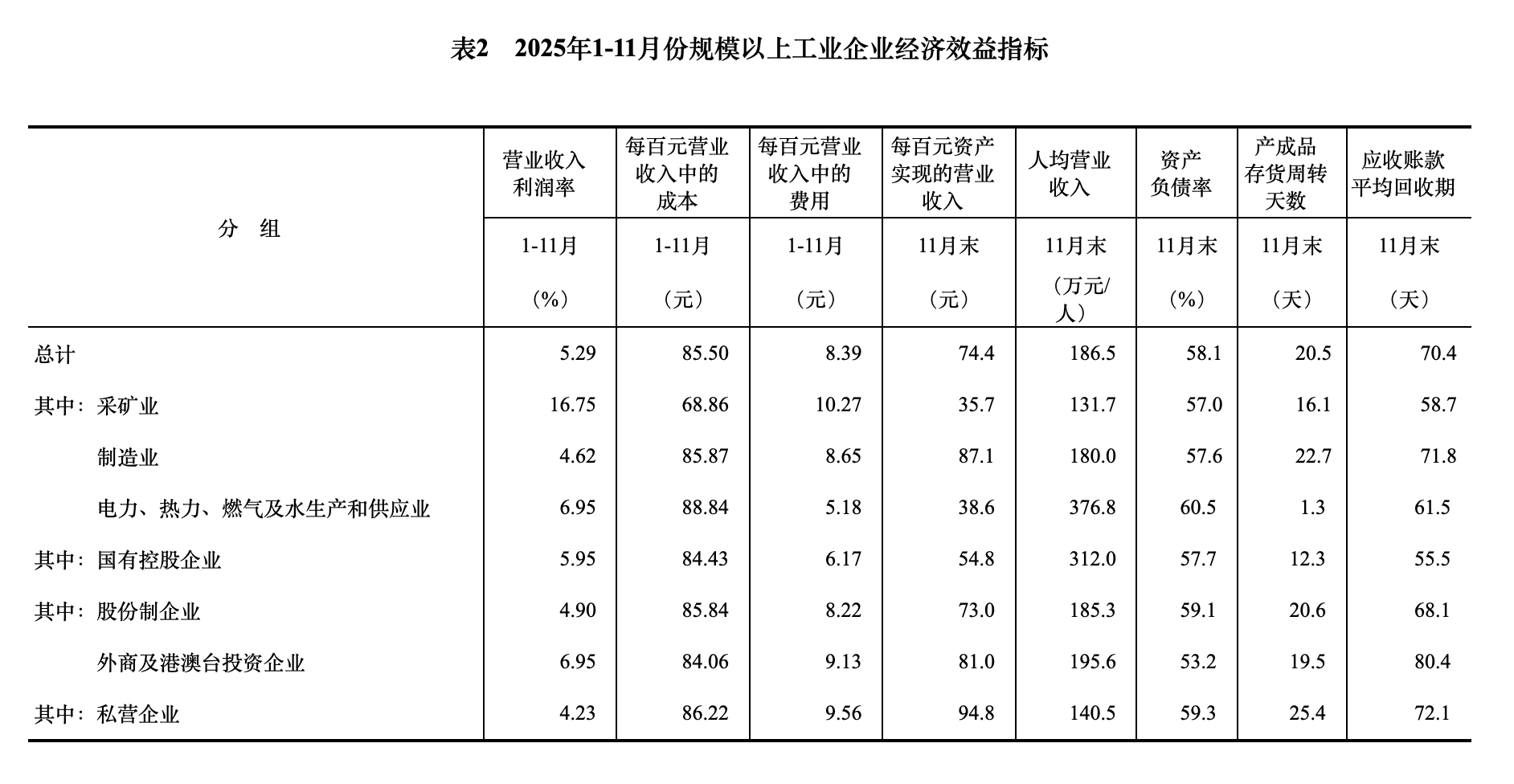 11月末,規(guī)模以上工業(yè)企業(yè)資產(chǎn)總計(jì)189.28萬億元,同比增長4.8%;負(fù)債合計(jì)109.96萬億元,增長5.0%;所有者權(quán)益合計(jì)79.32萬億元,增長4.5%;資產(chǎn)負(fù)債率為58.1%,同比上升0.1個(gè)百分點(diǎn)。
