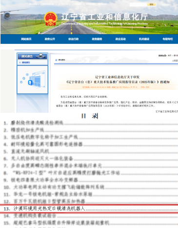 新年伊始,遼寧省工業(yè)和信息化廳正式印發(fā)《遼寧省首臺(套)重大技術(shù)裝備推廣應(yīng)用指導(dǎo)目錄(2025年版)》。我院申報的《沙漠環(huán)境用光熱定日鏡清洗機(jī)器人》 項目經(jīng)過嚴(yán)格評審,成功獲得“首臺(套)”重大技術(shù)裝備認(rèn)定,并被納入省級推廣應(yīng)用名錄。這是我院在高端裝備研發(fā)與產(chǎn)業(yè)化應(yīng)用領(lǐng)域取得的又一重要突破!