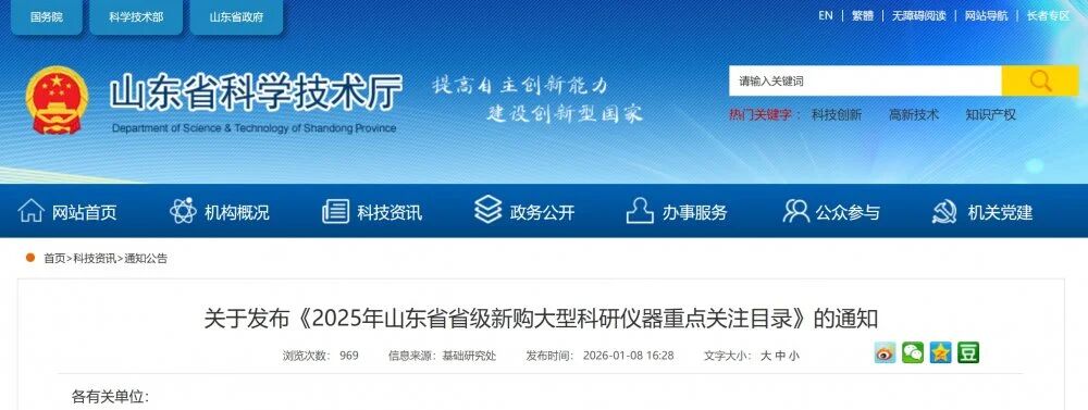 近日,山東省科學技術廳、山東省教育廳依托省大型科研儀器開放共享服務網數據,組織專家進行分析論證,對原值 50 萬元及以上大型科研儀器保有量、購置年限、使用績效、共享情況等核心指標進行定量分析與綜合研判,編制了《2025 年山東省省級新購大型科研儀器重點關注目錄》,X射線衍射儀、電感耦合等離子體發射光譜儀、電感耦合等離子體質譜儀、氣相色譜儀、液相色譜儀、流式細胞儀、激光共聚焦顯微鏡、超高速離心機、熒光定量PCR儀等9類儀器入選重點關注儀器。