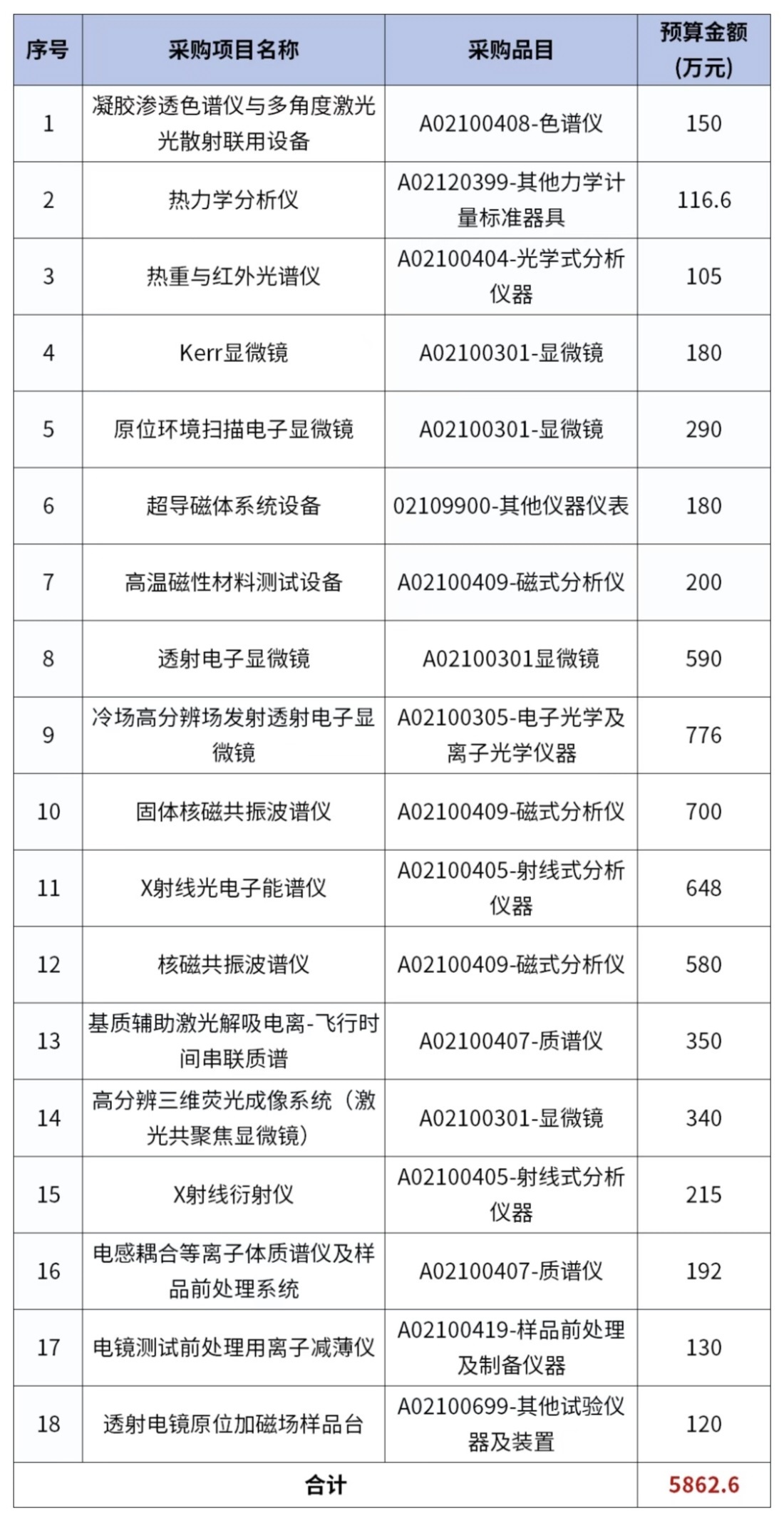 東華大學近日發(fā)布多項儀器設備采購計劃,擬采購凝膠滲透色譜儀與多角度激光光散射聯(lián)用設備、熱力學分析儀、熱重與紅外光譜儀、Kerr顯微鏡、原位環(huán)境掃描電子顯微鏡、超導磁體系統(tǒng)設備、高溫磁性材料測試設備等,項目預算總額5862.6萬元,采購項目均計劃于2026年3月實施。