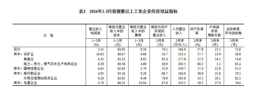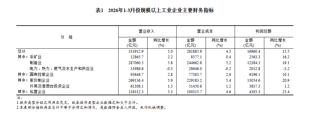 【數據發布】2026年1—3月份全國規模以上工業企
